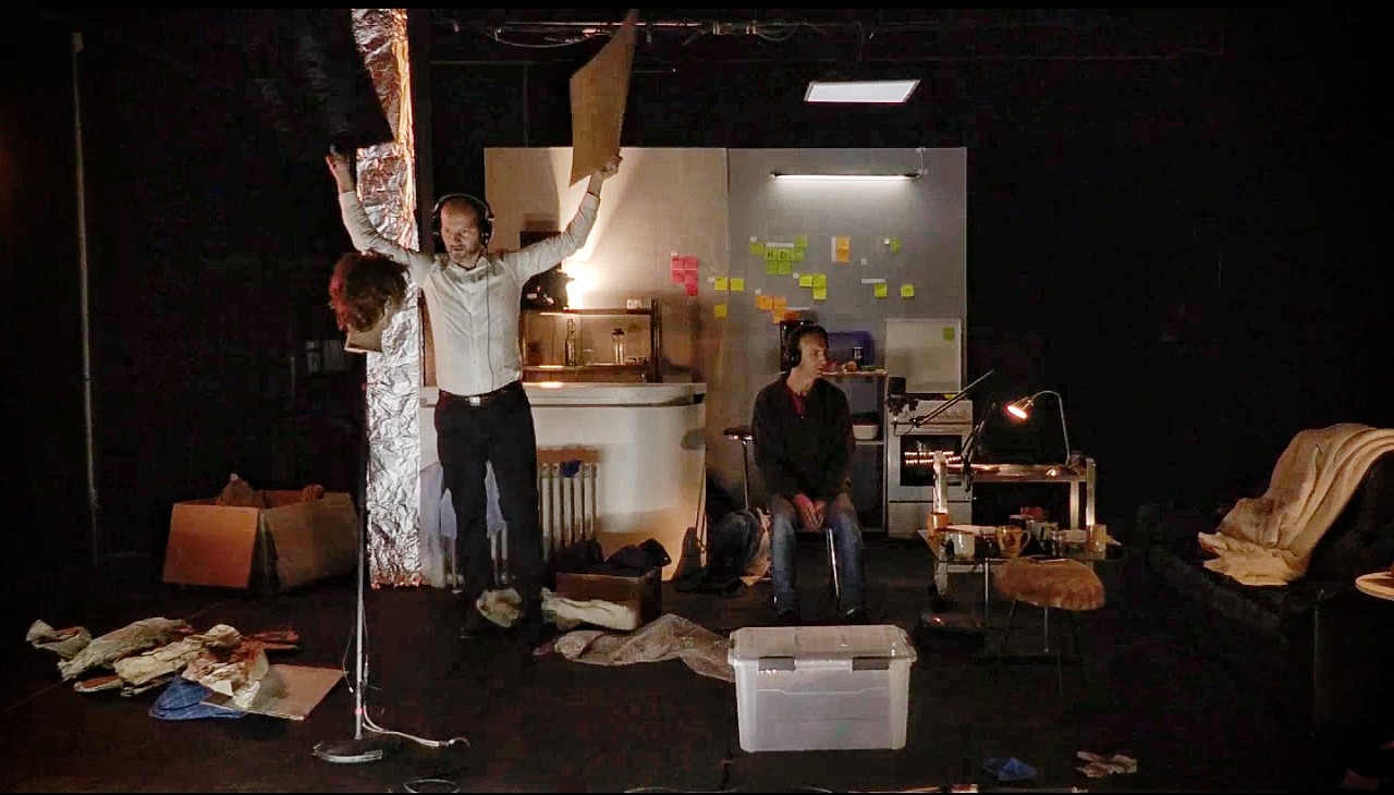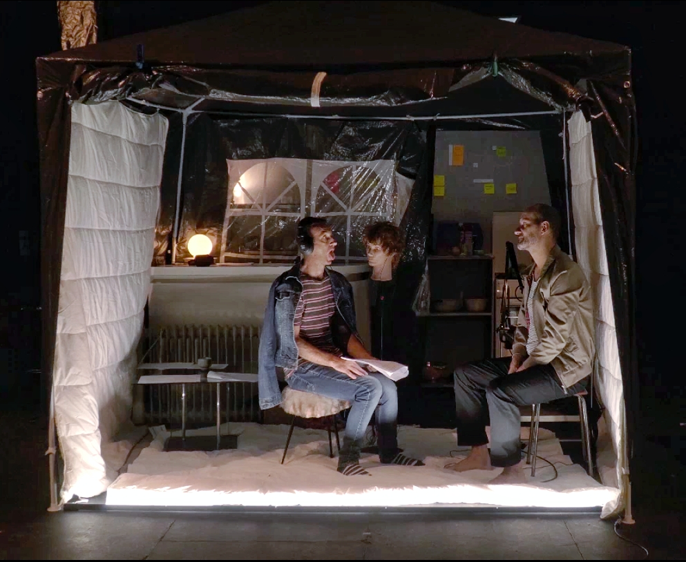 Chaque spectateur sera équipé d’un casque. Il pourra le mettre quand il veut : par cet intermédiaire, nous l’incitons à créer son regard de spectateur, à faire ses choix. C’est une façon de créer de l’aléatoire. Dans le casque, on entendra des sons préenregistrés - averses, musiques, documents sonores - , mais aussi les sons du plateau, enregistrés en direct, spatialisés dans les écouteurs et amplifiés. Le casque a cette vertu à la fois d’isoler et en même temps de rapprocher de la scène, des acteurs, comme dans un gros plan sonore. Si le podcast est la possibilité pour les personnages de faire entendre leur voix, le casque est aussi pour les spectateurs la possibilité d’entendre les voix que l’un des deux frères est seul à entendre. La question de l’écoute est centrale.
